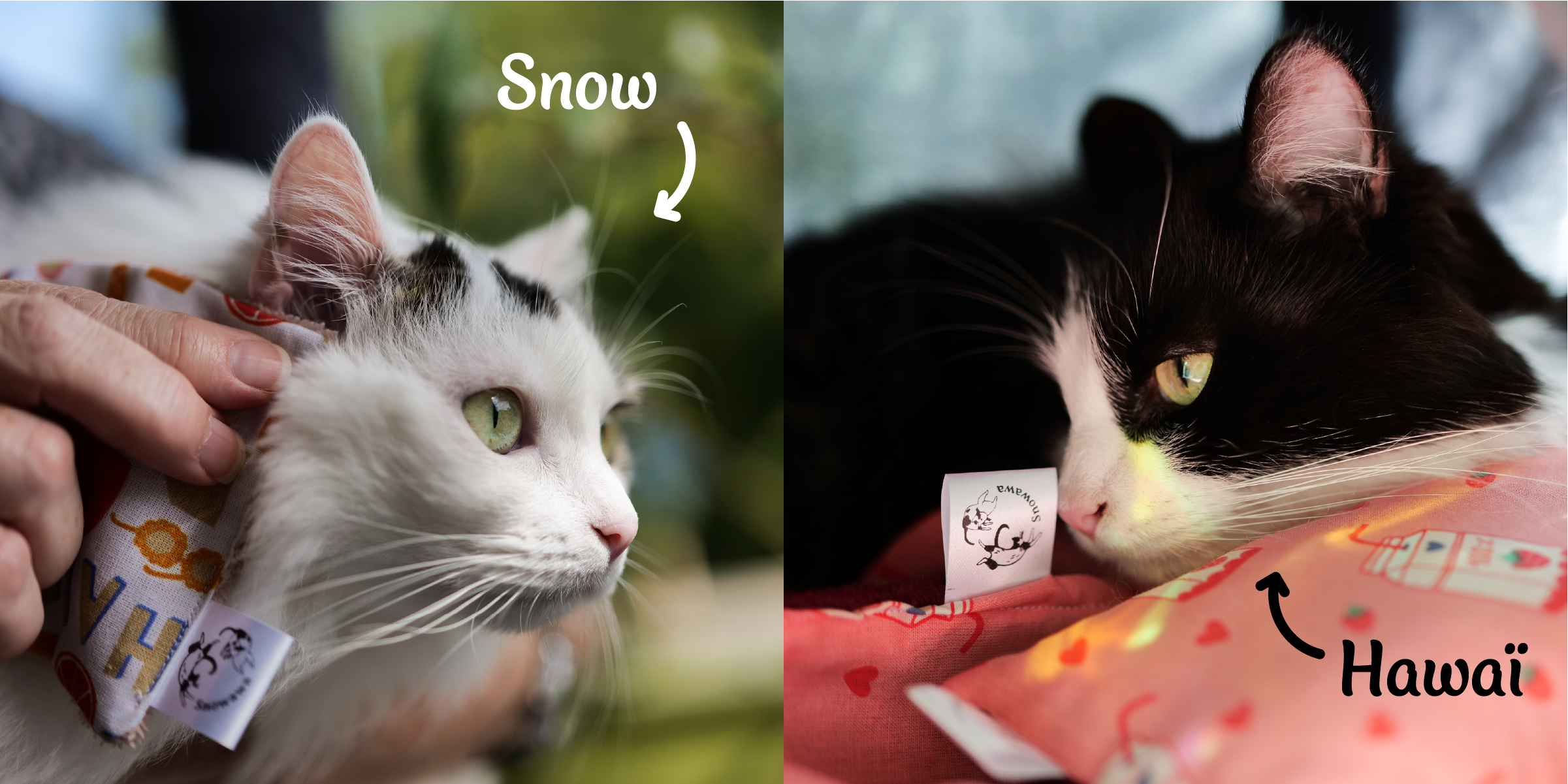 Tout commence avec Snow et Hawaï, deux âmes adoptées à la SPA qui, suite à un besoin personnel, ont fait germer une idée en 2023 : créer Snowawa. Une marque d’accessoires et équipements textiles pour animaux, pensée et cousue avec le cœur (et un soupçon de magie 🪄) par moi-même, Mylène, pour répondre aux besoins réels de nos compagnons de vie et de leurs humains.