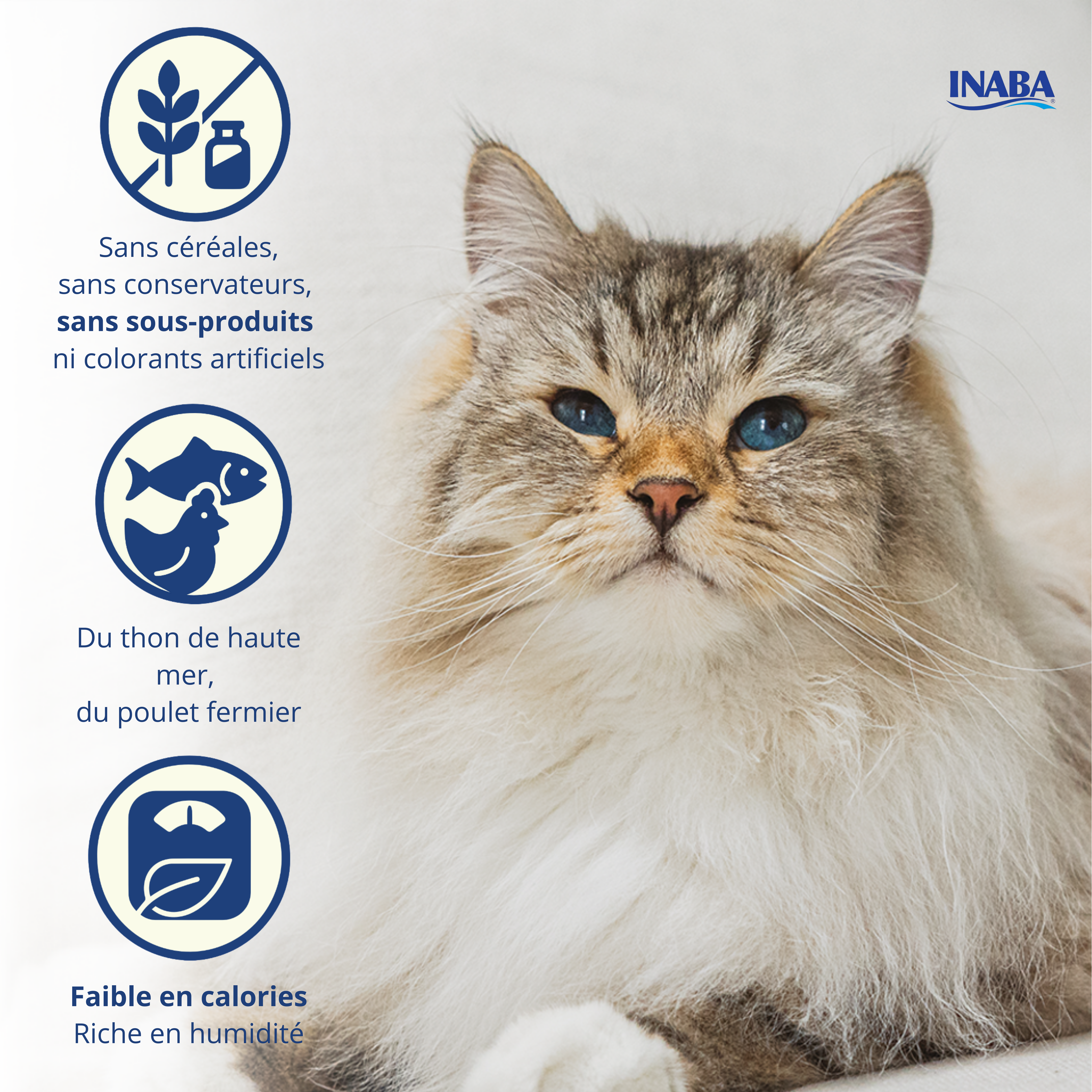 L'ensemble des produits Inaba sont reconnus pour leur qualité premium, sans sous-produits de l'alimentation humaine, sans colorants ou conservateurs artificiels.